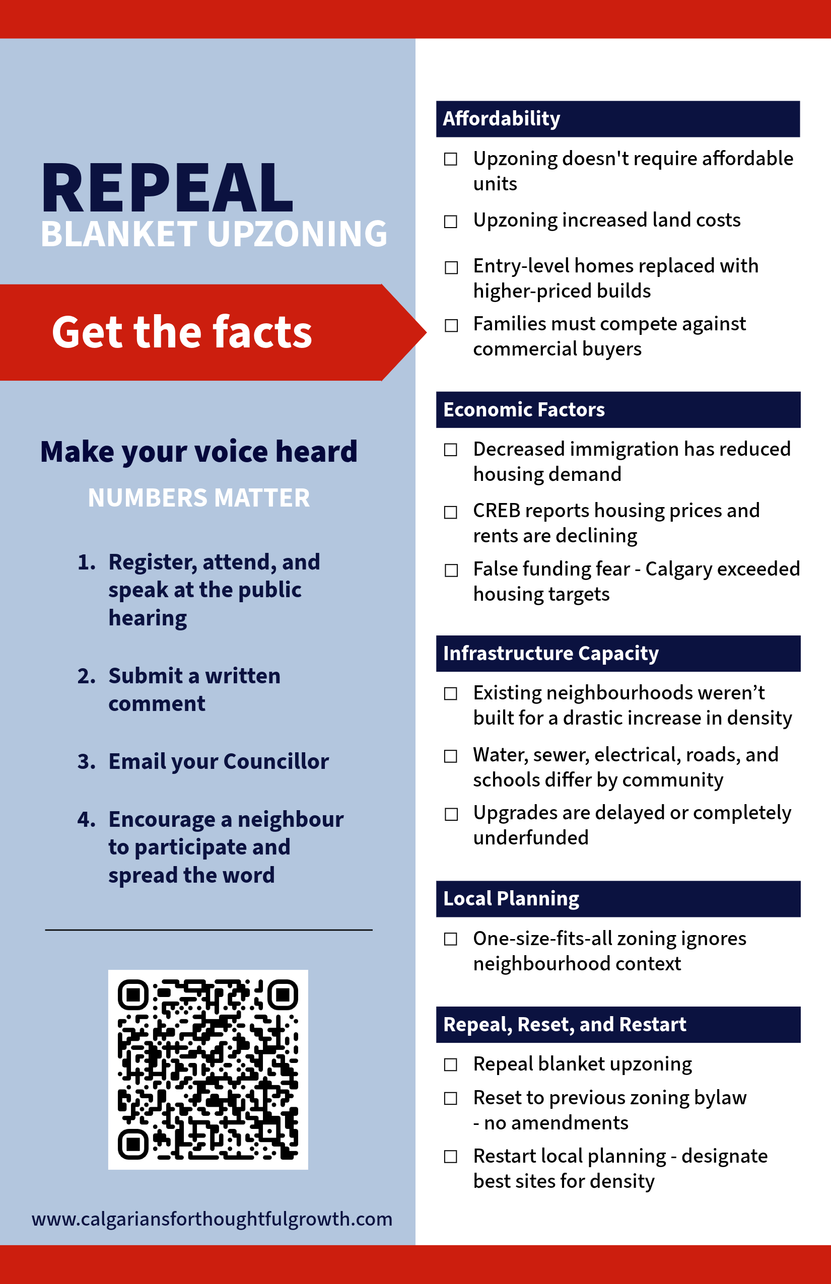 Blanket upzoning is going to Council March 23rd, 2026 and we need you to participate to get blanket upzoning repealed. Councillors often count voices, not just arguments. Consistency and participation matter. The public has already spoken at the initial public hearing in 2024 and most recently at the ballot box last fall. Now we must ensure that the voice of Calgarians opposed to BUZ is heard one final time.